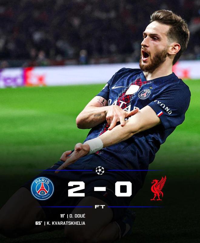 仅仅过了11分钟,若昂·内维斯左路送出穿透性直塞,克瓦拉茨赫利亚带球连过数人,如入无人之境般杀入禁区低射破门,大巴黎2-0利物浦。