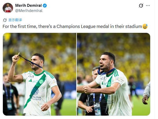 德米拉尔社媒嘲讽胜利:他们的球场里第一次有了亚冠冠军奖牌