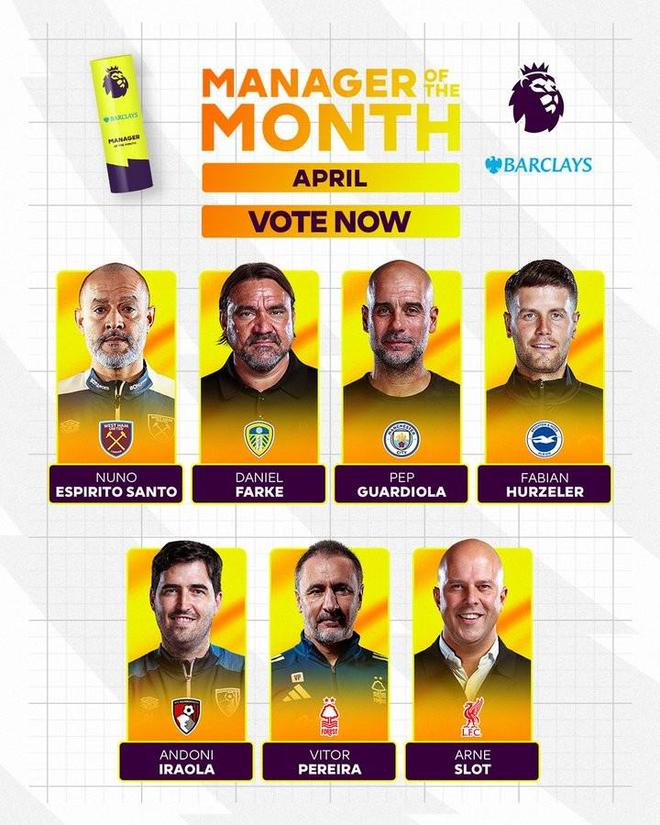 北京时间4月30日,英超联赛官方公布了英超4月最佳主帅候选,其中瓜迪奥拉、斯洛特在列,佩雷拉入选。