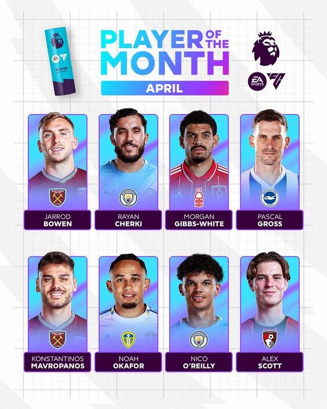 英超四月最佳球员候选:谢尔基、奥赖利入选,鲍恩在列