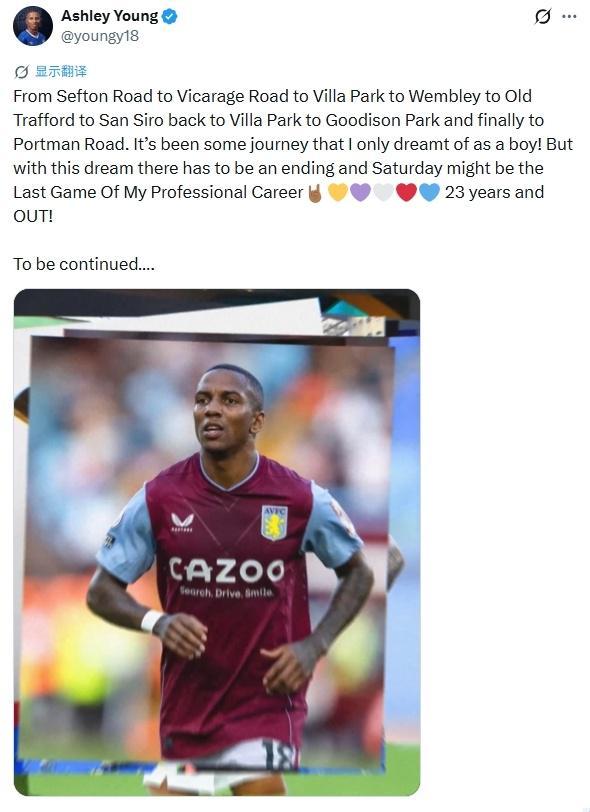 阿什利-扬还表示,周六或许将是自己职业生涯的最后一场比赛。本周六19点30分,英冠第46轮收官战,伊普斯维奇将主场迎战女王公园巡游者。