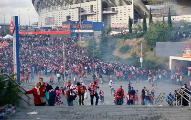 赛前马竞球迷向警方投掷杂物场面失控,警方发射了催泪瓦斯
