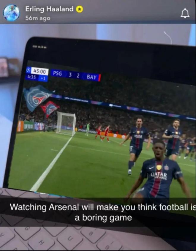 哈兰德配文写道:“看阿森纳踢球会让你觉得足球很无聊。”(Watching Arsenal will make you think football is a boring game.)